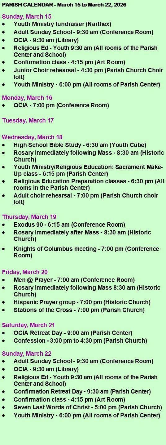 Saturday: 3:00 pm to 4:30 pm in the Parish Church