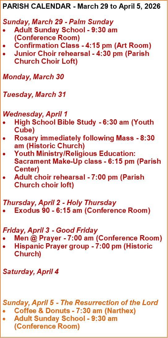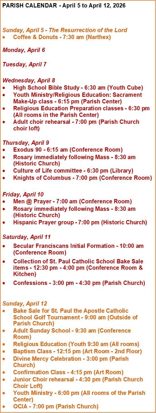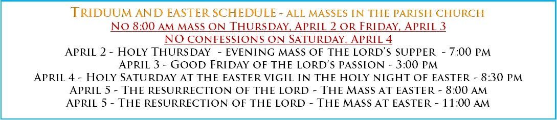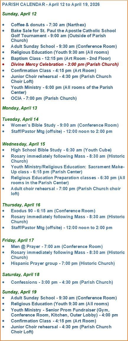 Saturday: 3:00 pm to 4:30 pm in the Parish Church